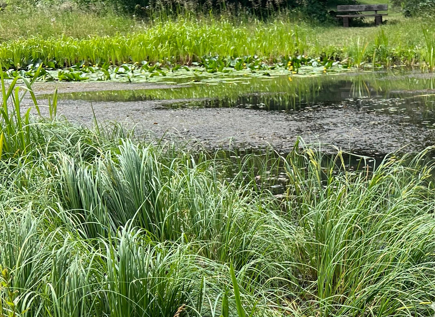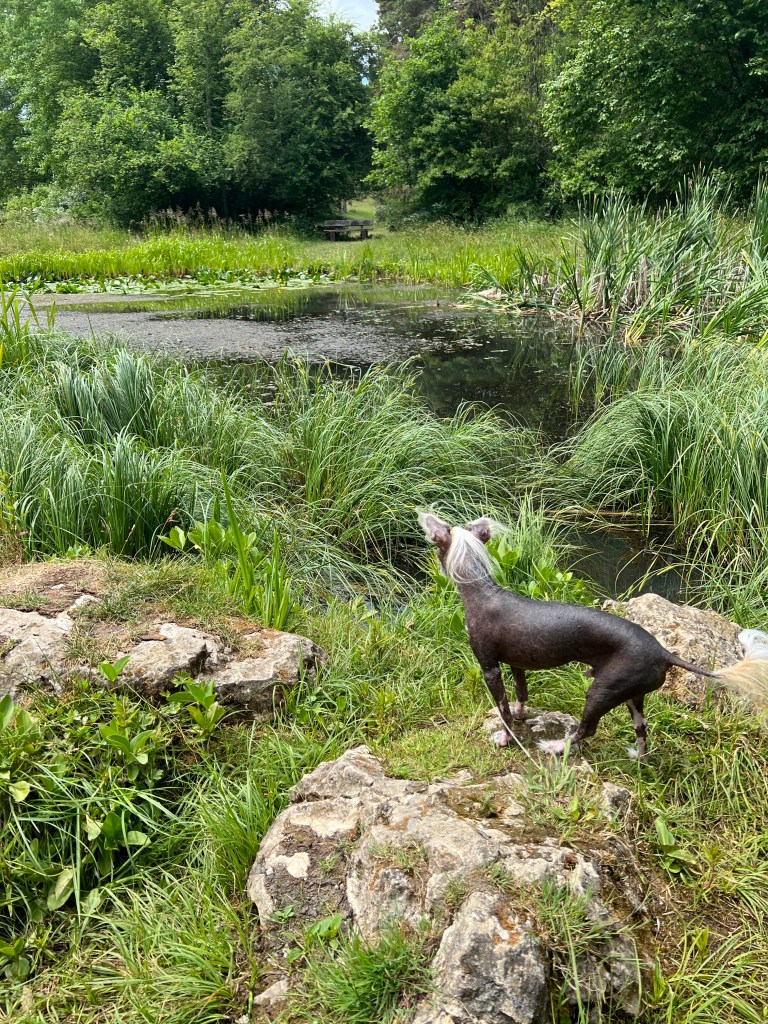 Am Froschteich angelangt, liebe ich es einfach auf einer Bank zu sitzen, meine Gedanken treiben zu lassen und meine Hunde bei ihren Erkundungen zu beobachten.